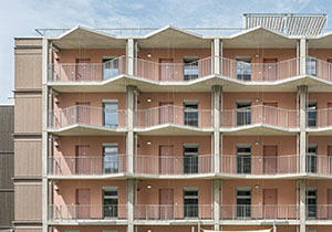 Die Freiraumgestaltung von Carla Lo ist durch einen hohen Grünanteil gekennzeichnet. Neben vertikalen Begrünungen der Laubengänge über versetzte Vor- und Rücksprünge wurde das Dach als zentraler Grün- und Erholungsraum intensiv bepflanzt.